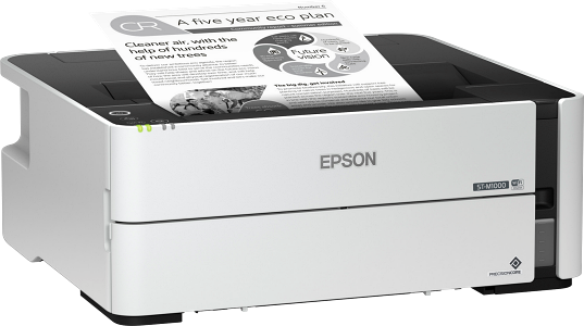 The WorkForce ST-M1000 monochrome supertank printer, powered by PrecisionCore®, offers worry-free, Cartridge-Free Printing with an easy-to-fill, supersized ink tank. It includes up to 2 years of ink in the box. Users save up to 75 percent with low-cost replacement bottles vs. mono laser toner — about 1/3 of 1 cent per ISO page vs. 2 ½ cents. The ST-M1000 includes enough ink to print up to 11,000 pages black. It features fast print speeds and a fast first page out. Plus, it offers a 250-sheet paper tray, auto 2-sided printing, and convenient wired and wireless networking. You save energy with lower power consumption vs. laser. And, it’s backed by a 2-year limited warranty.